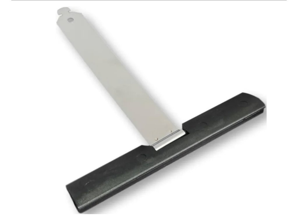 Třmen pancíře (závěs) venkovní okenní rolety. Třmen slouží pro pojení pancíře lamel venkovní rolety a navíjecí hřídele.